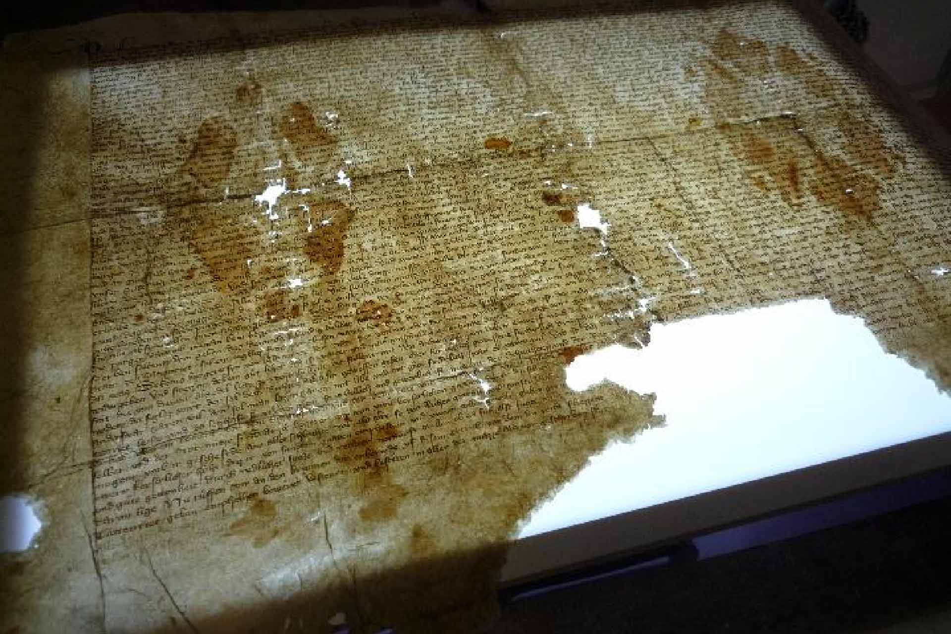 La restauration des parchemins exige une précision exceptionnelle et une grande patience. Chaque pièce est soigneusement nettoyée et humidifiée dans des conditions contrôlées pour permettre leur mise à plat. Si nécessaire, des consolidations et comblements sont réalisés en papier japonais ou parchemin. Afin d’assurer une protection durable au document, des conditionnements sur-mesure peuvent également être réalisés.