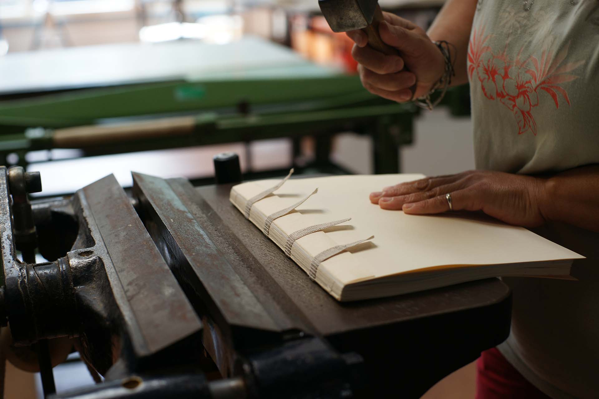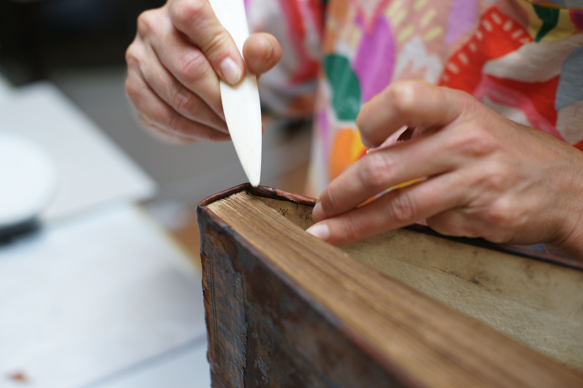 Nous avons à notre disposition une diversité de matériaux (peau de veau, peau tannée à l’alun, parchemin…) et de techniques (dos avec ou sans nerfs, réalisation de tranchefiles brodées…) qui nous permettent de préserver au mieux l’authenticité historique du document tout en lui offrant une nouvelle stabilité pour les années à venir.